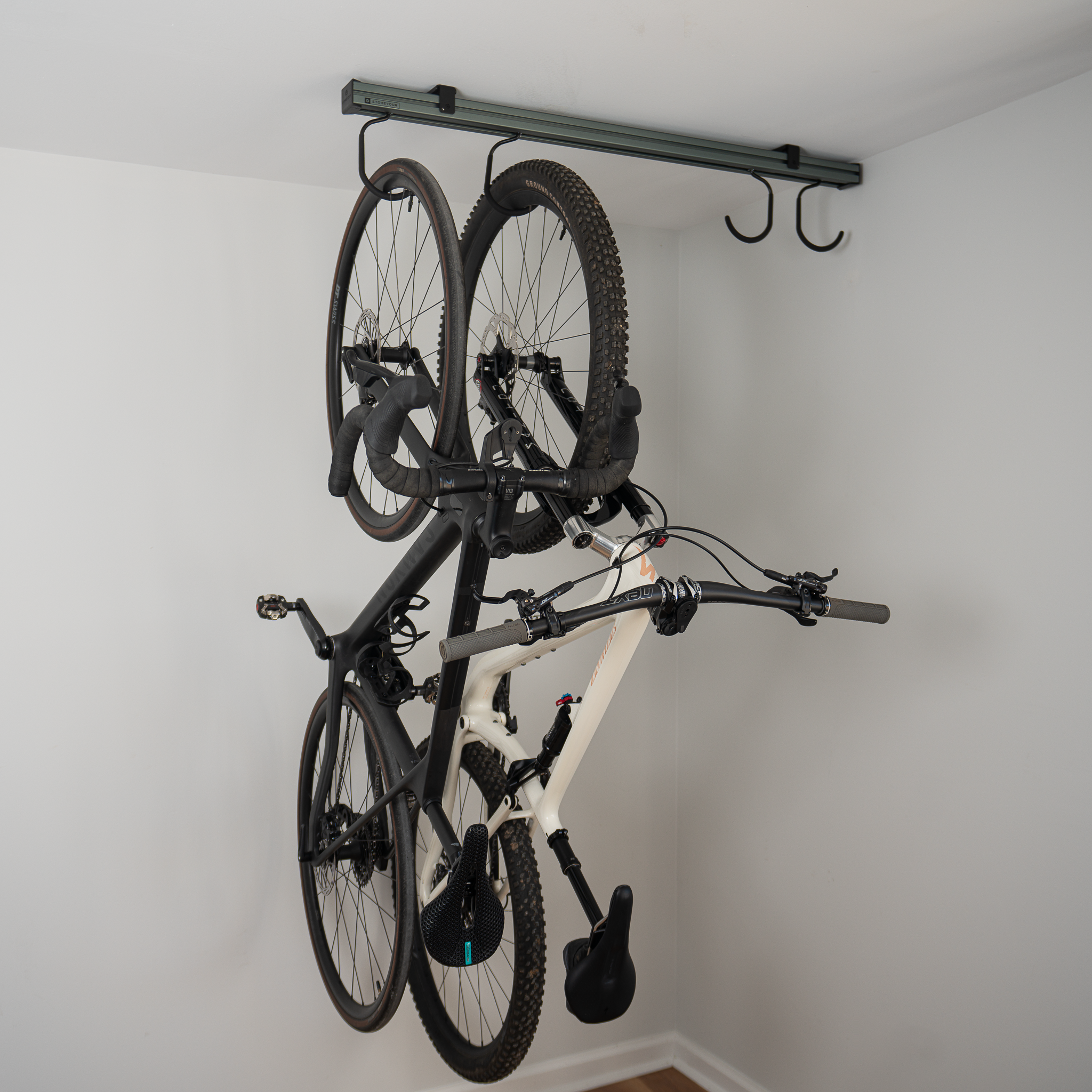 Elevate disorganized bikes overhead, and reclaim your walkways, storage spaces, and even your car’s parking spot. Perfect for mountain bikes, road bikes, gravel bikes, e-bikes, and more.