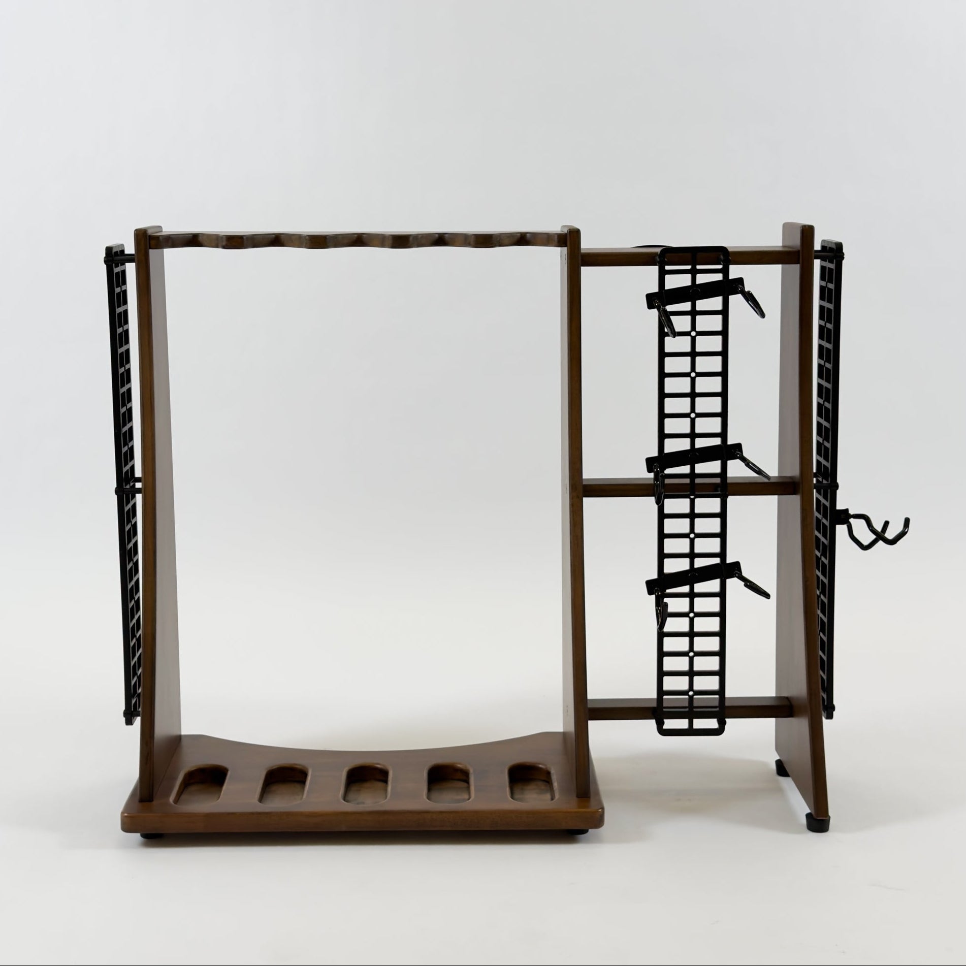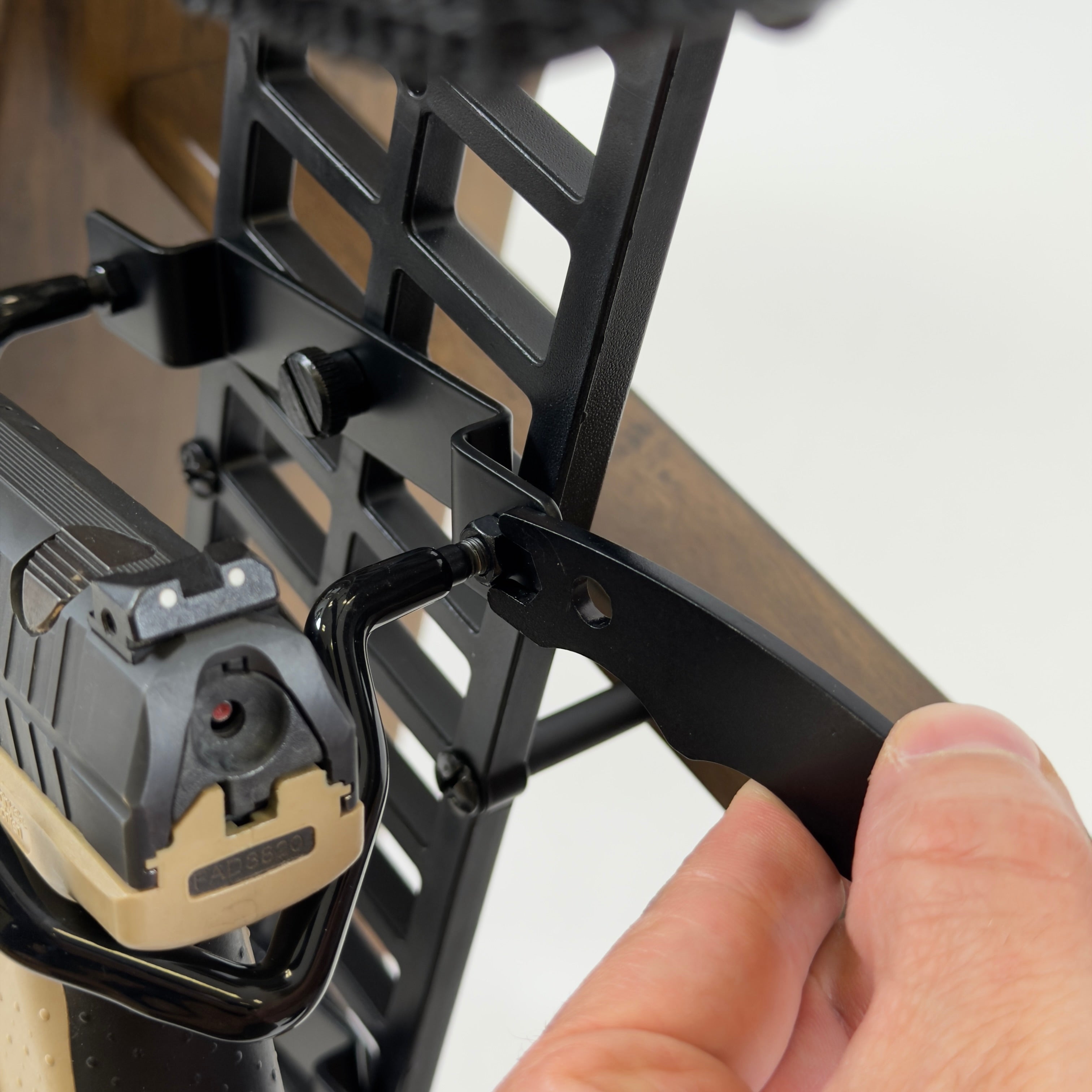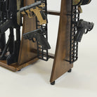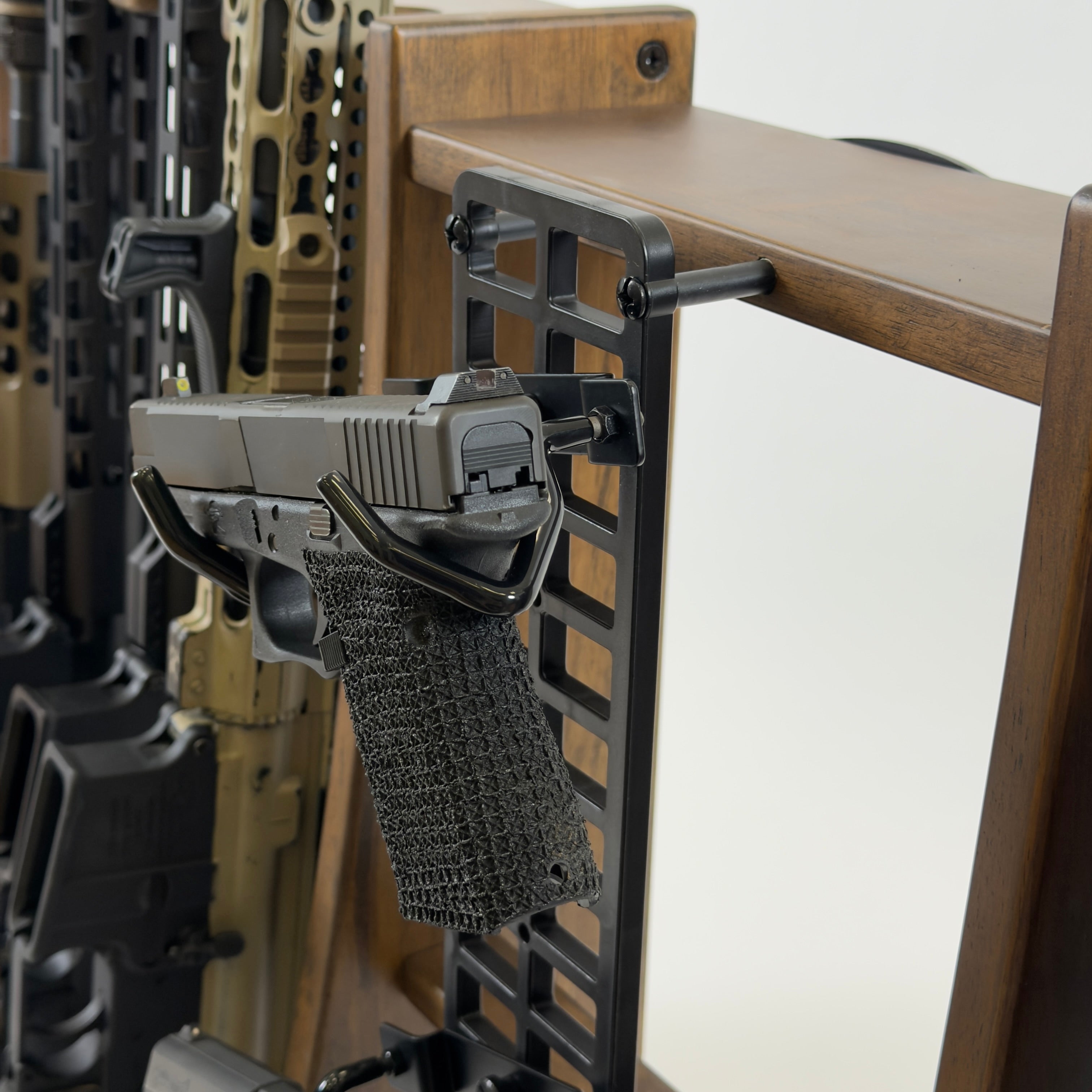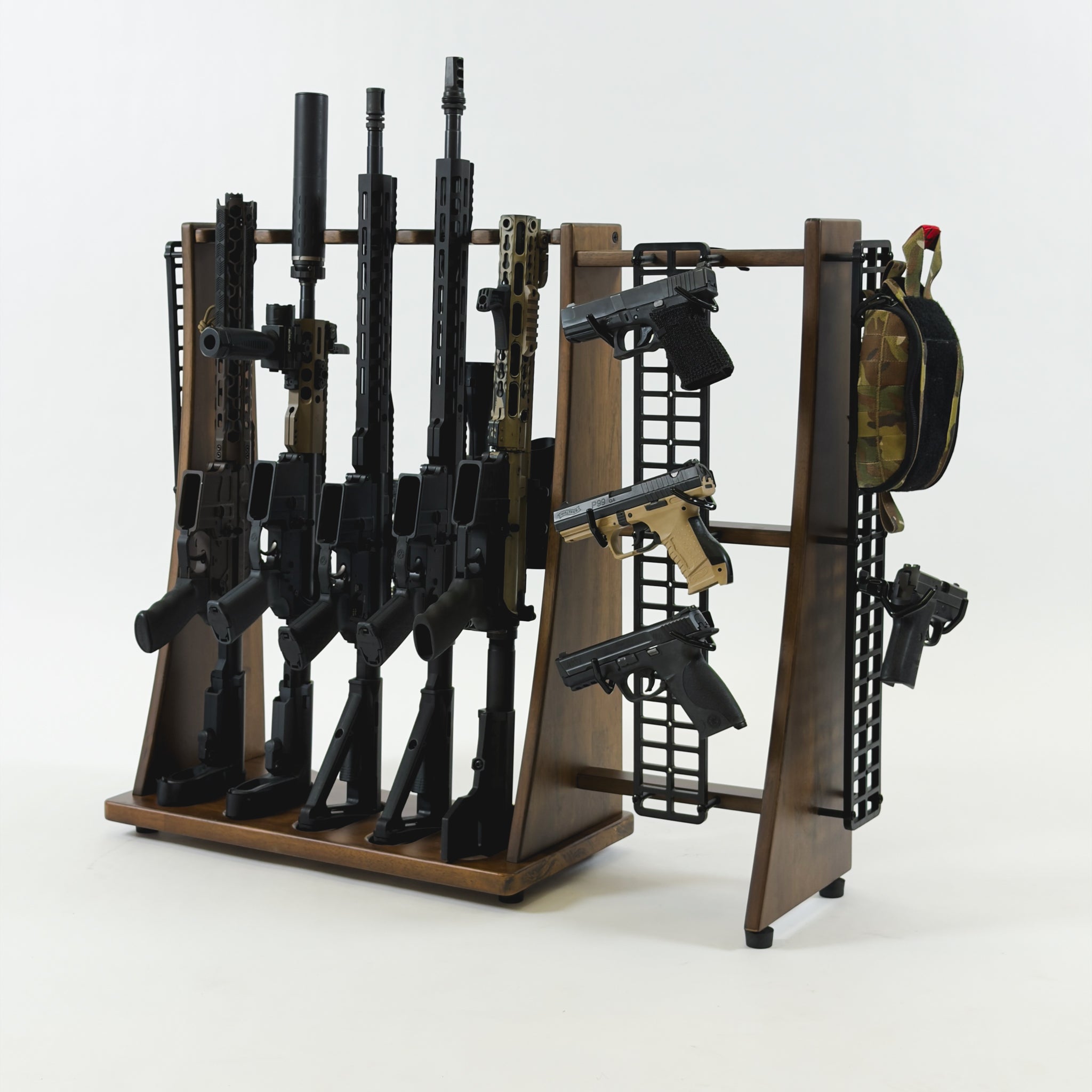 Organize your firearms and elevate the appearance of your office, living room, garage, or closet with this beautiful freestanding display. Accommodates 5 rifles and 4 pistols in addition to countless MOLLE Panel configurations for a wide range of shooting enthusiasts.