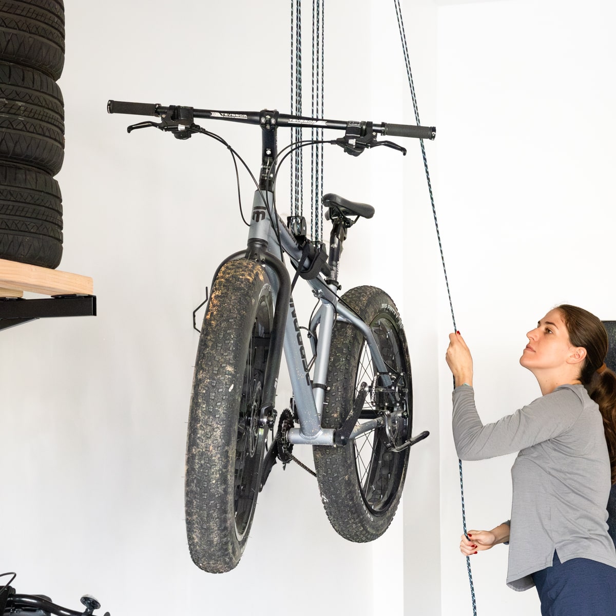 Store your bike overhead with ease using the Heavy-Duty hoist system with a 4:1 mechanical advantage, reducing the lifting effort by 75%. Hoist bikes up to 70 lbs with minimal effort.