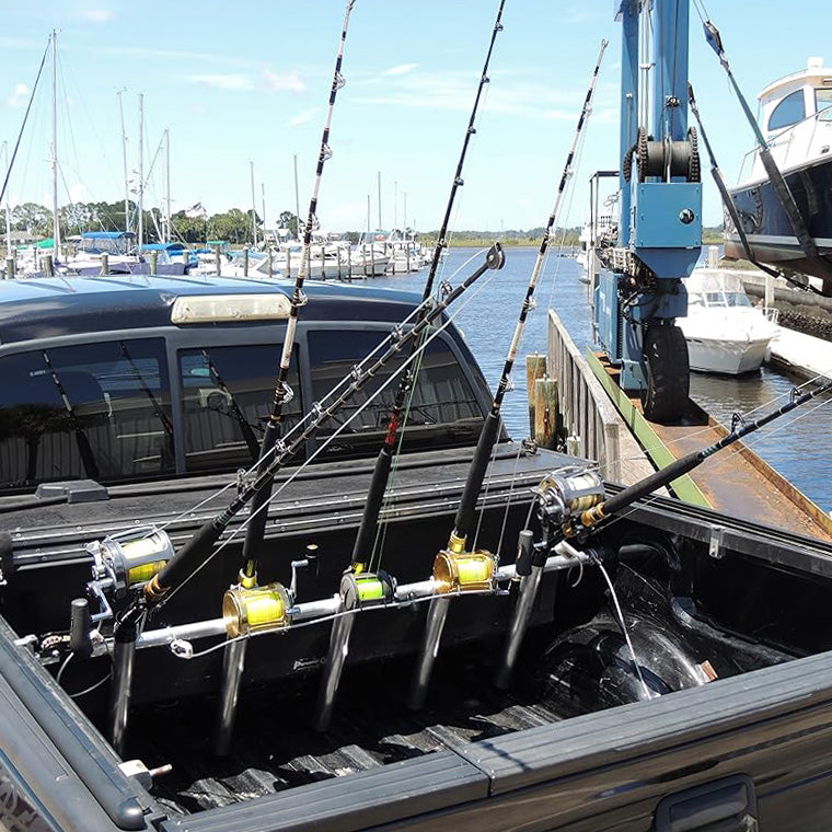 The easiest way to get your rods to and from the water. The pressure mount design is universally compatible with every truck bed.