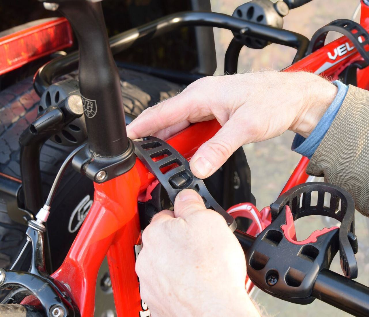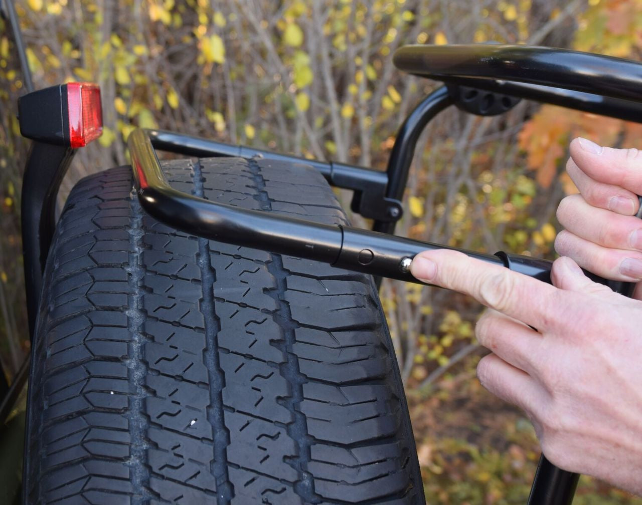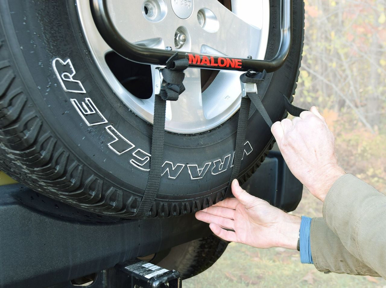 The rack's frame fits snuggly over the top of your tire and included webbing straps firmly secure everything in place.