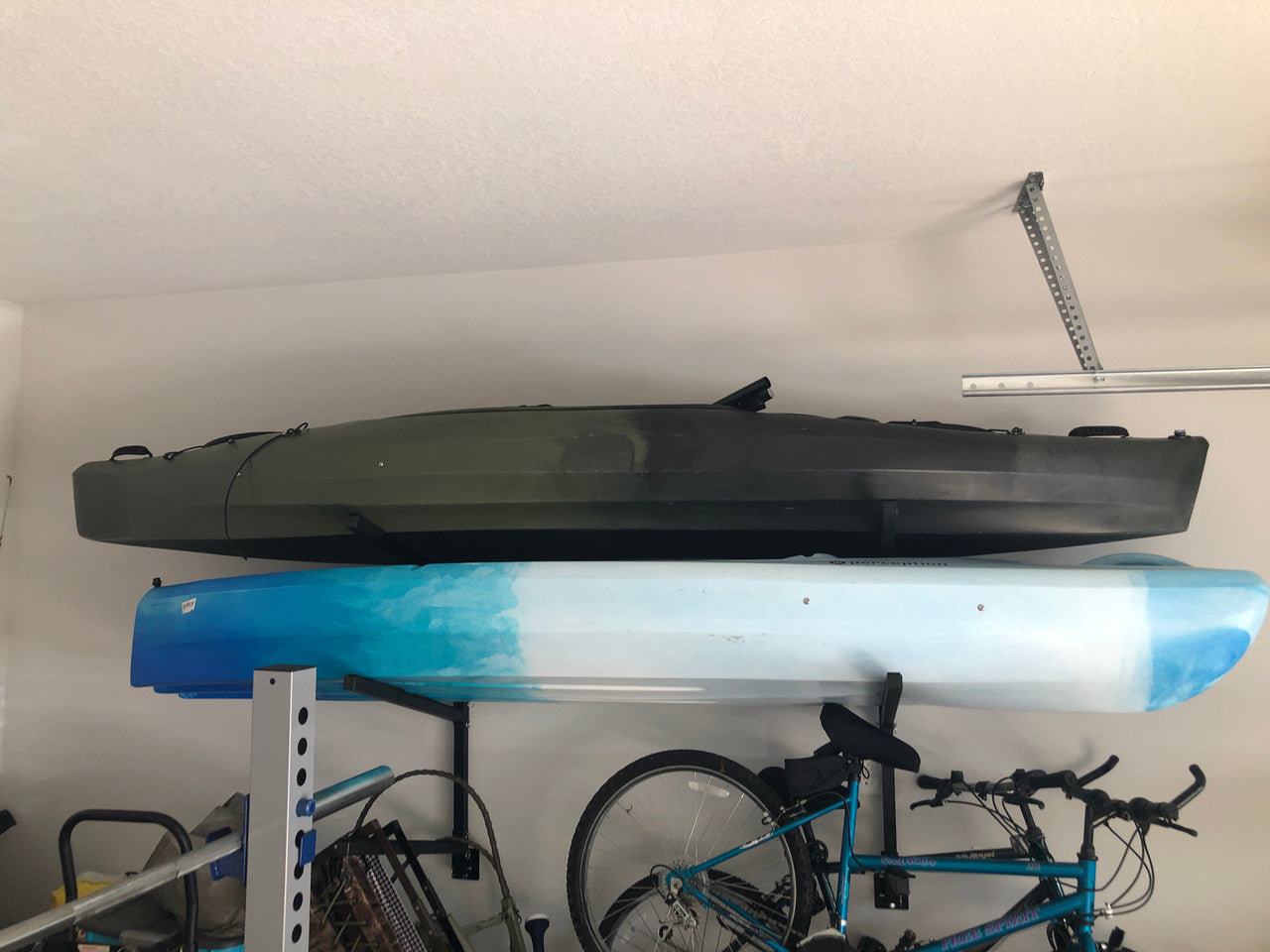 A heavy-duty adjustable metal wall storage rack that can hold up to 4 kayaks