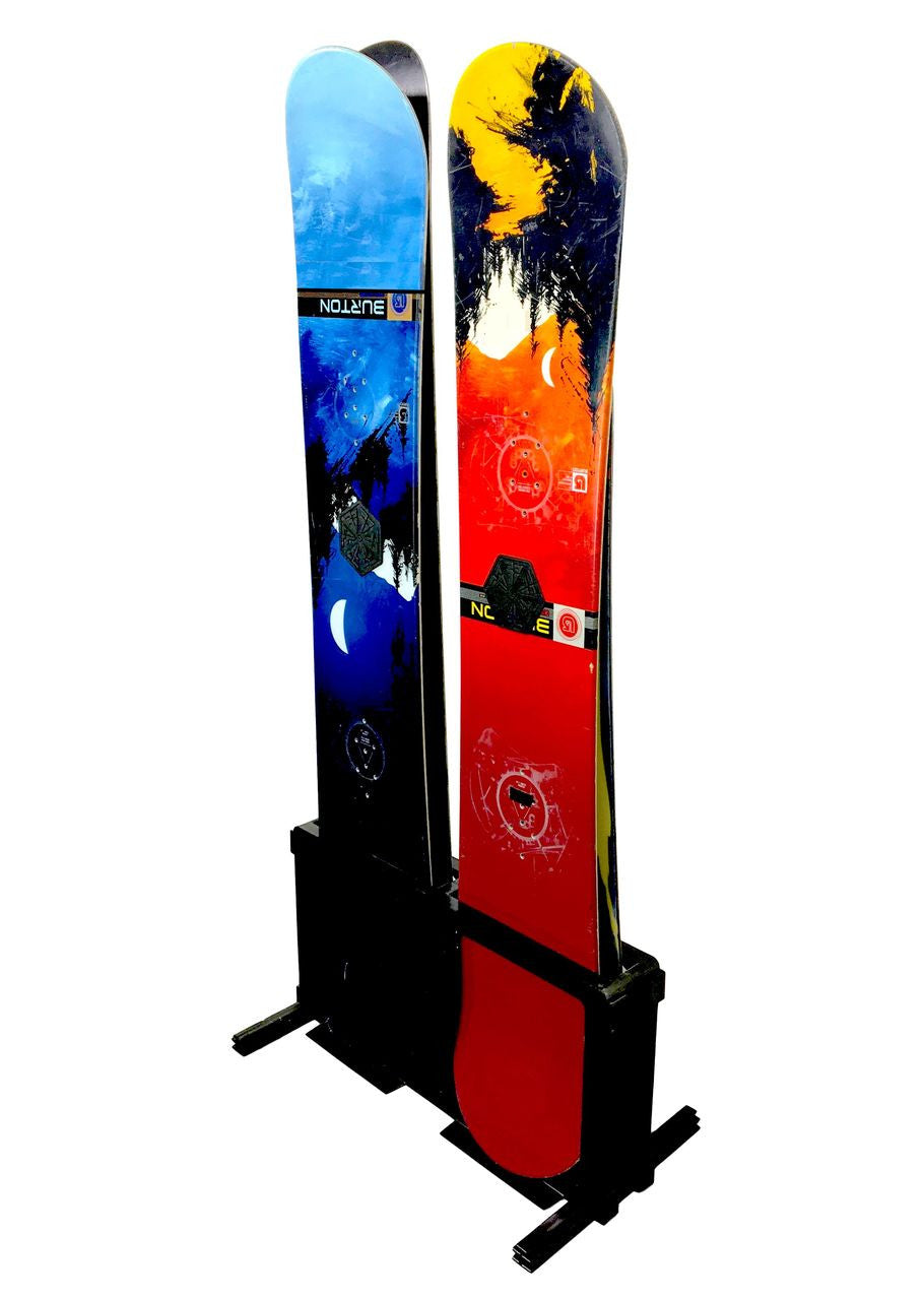 a resort style snowboard rack that acts as a floor stand and will hold up to...