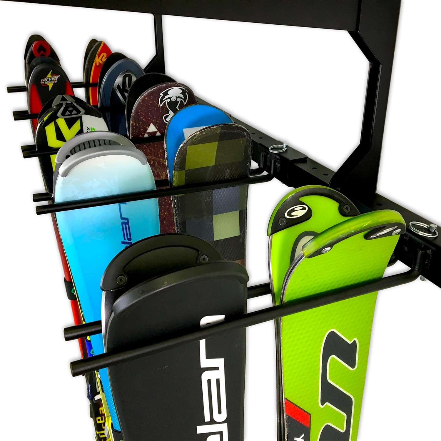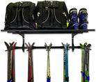 An adjustable ski storage rack with shelf that holds up to 10 pairs of skis a...